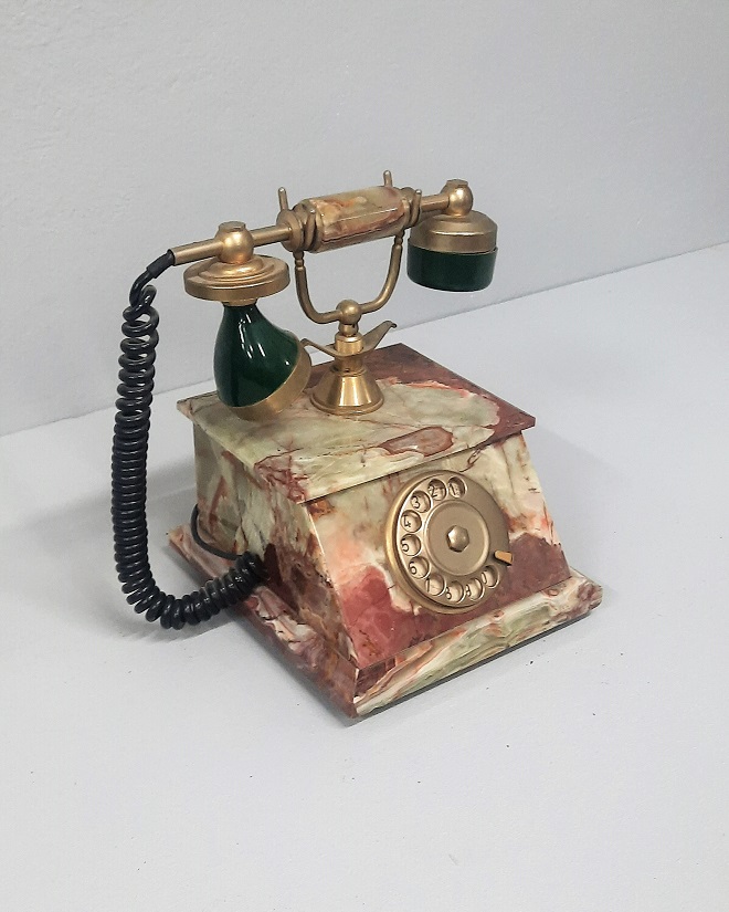 Stylowy, dekoracyjny telefon z epoki – wykonany z masywnego onyksu w pięknych odcieniach beżu i zieleni. Klasyczny design z obrotową tarczą i mosiężnymi elementami sprawia, że to idealny akcent do wnętrz vintage, glamour czy eklektycznych. • Oryginalna niemiecka końcówka (do wymiany na polską) • Stan bardzo dobry • Funkcjonalny i estetyczny – łączy praktyczność z charakterem Doskonały jako element wystroju do salonu, gabinetu lub stylowej witryny. Unikatowy dodatek, który przyciąga uwagę i tworzy klimat dawnych lat.