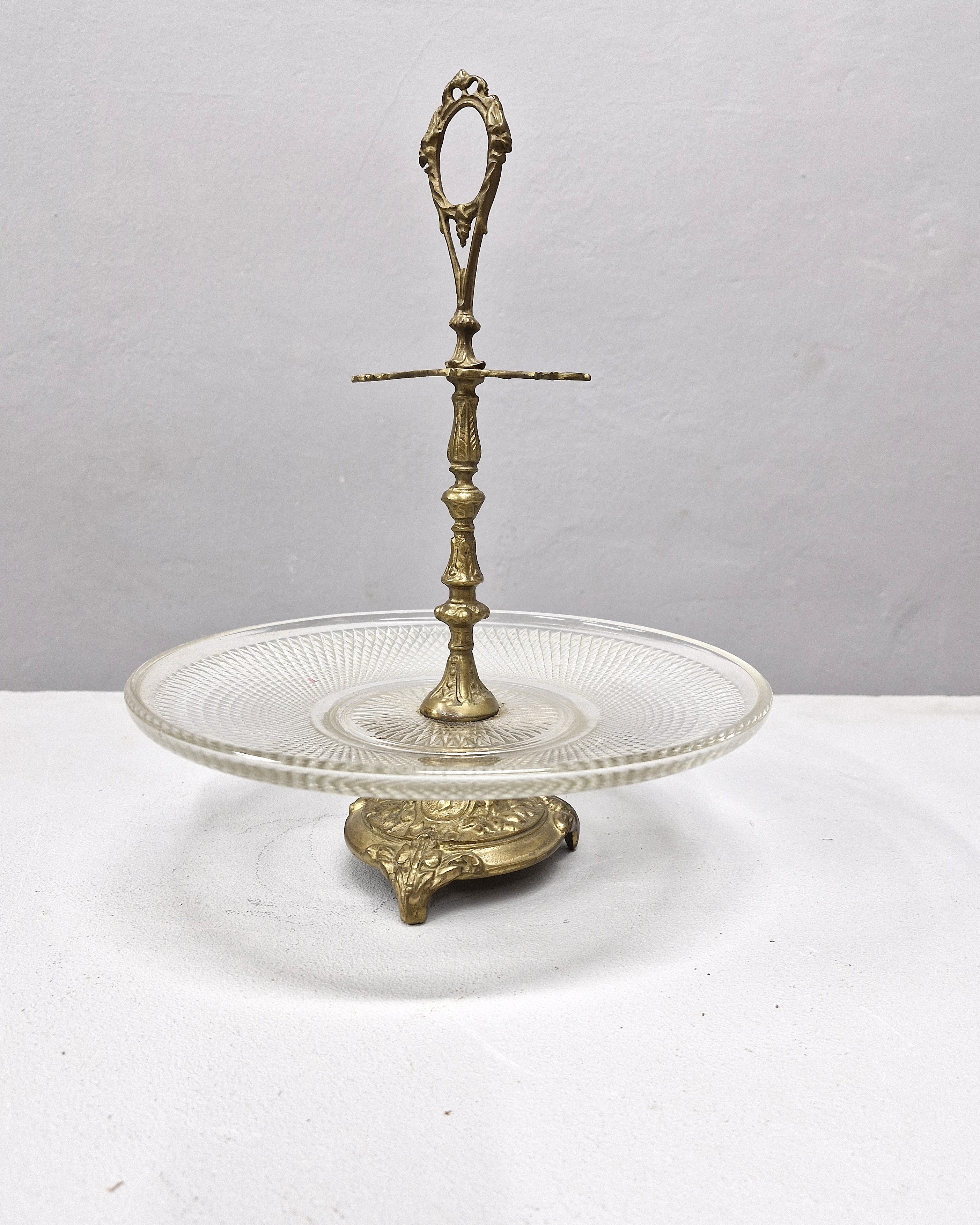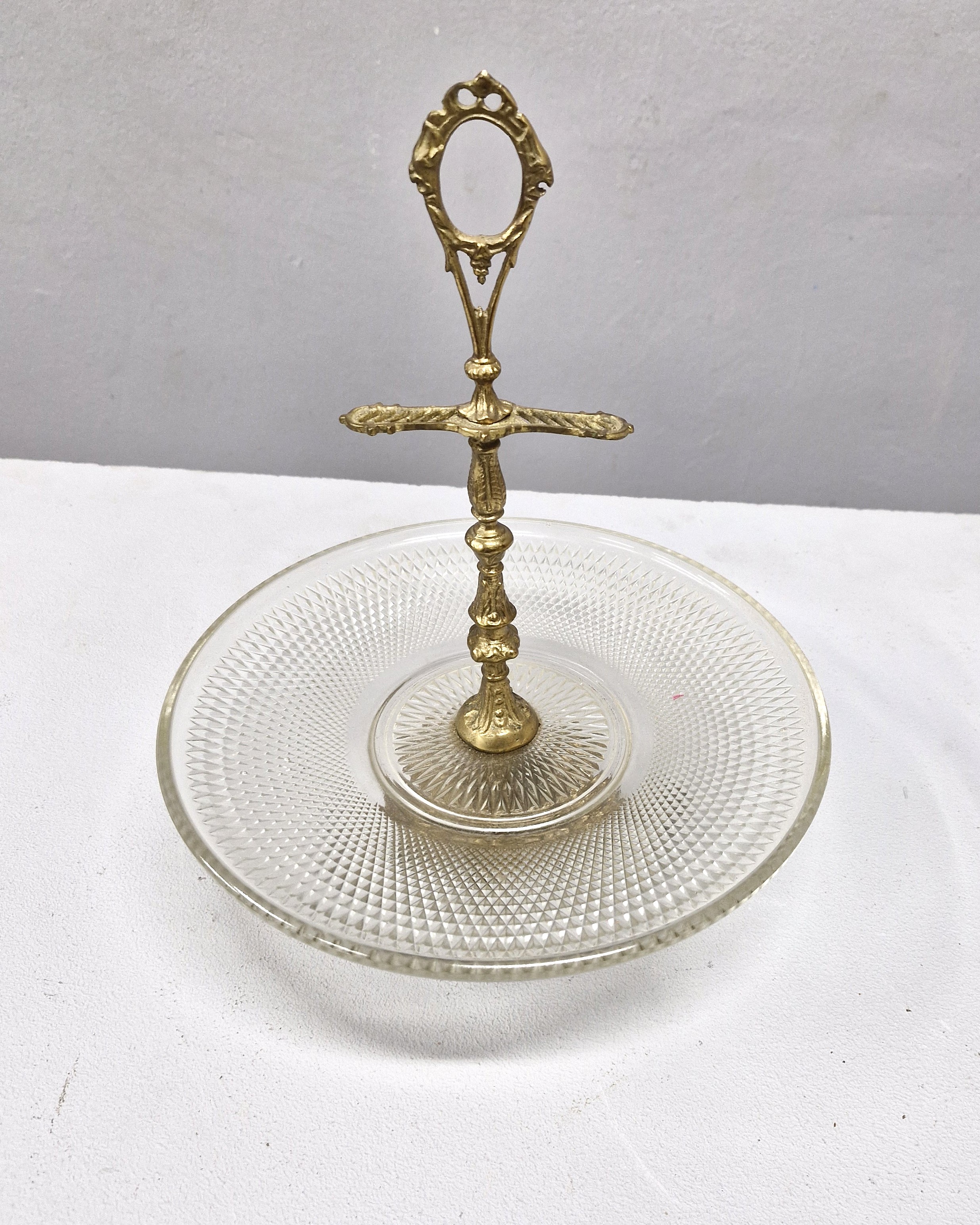 Na sprzedaż piękna patera w stylu vintage. Bardzo efektowny, wysoki uchwyt ułatwiający przenoszenie. Talerz szklany o ciekawej fakturze, stabilna podstawa na nóżkach. Przedmiot ciężki i solidny.